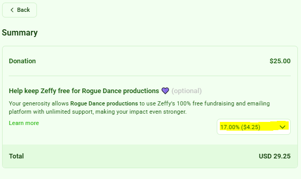 OPTIONAL: Zeffy will pre-select an additional amount for you to contribute to their mission. If you click “Learn More” you will see their statement: